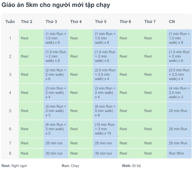 Theo giáo án chạy 5km cho người mới bắt đầu chạy kéo dài tám tuần này, runner chỉ chạy ba buổi mỗi tuần, xen kẽ với các ngày nghỉ để cơ thể có thời gian hồi phục và thích nghi. Mỗi buổi, bạn sẽ tập khoảng 20 đến 30 phút, thêm khoảng 10 phút để khởi động và giãn cơ.
